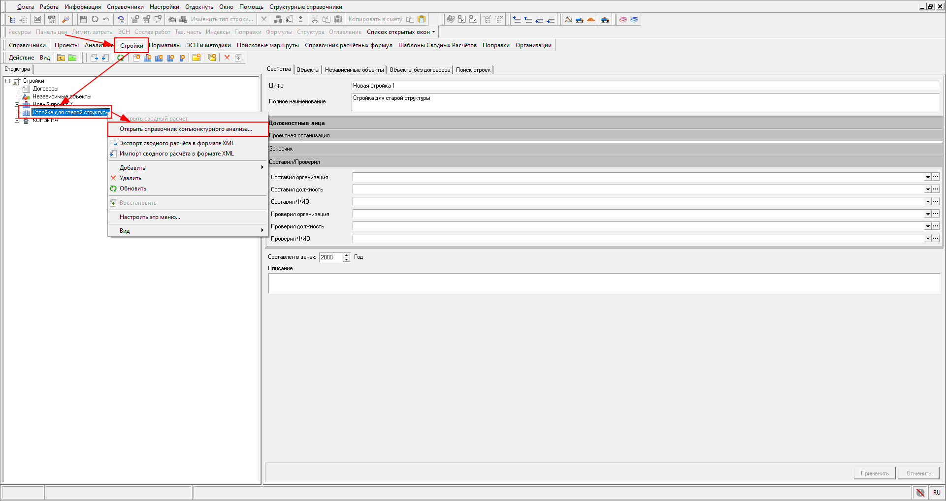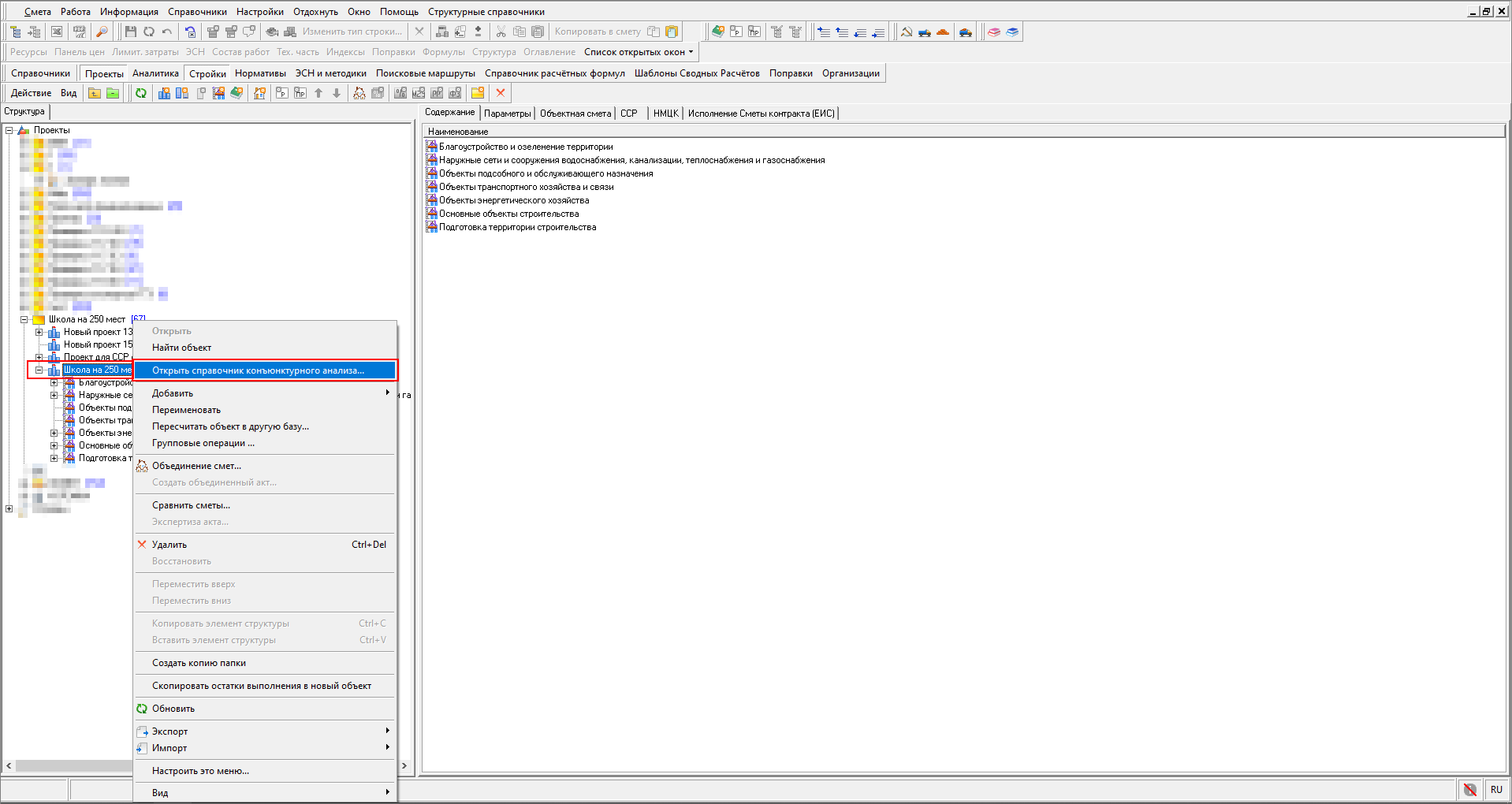 Открытие Справочника конъюнктурного анализа доступно в справочнике Проекты из контекстного меню любого узла сметной документации, за исключением Папки и Корзины