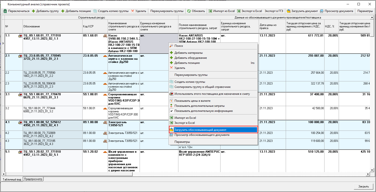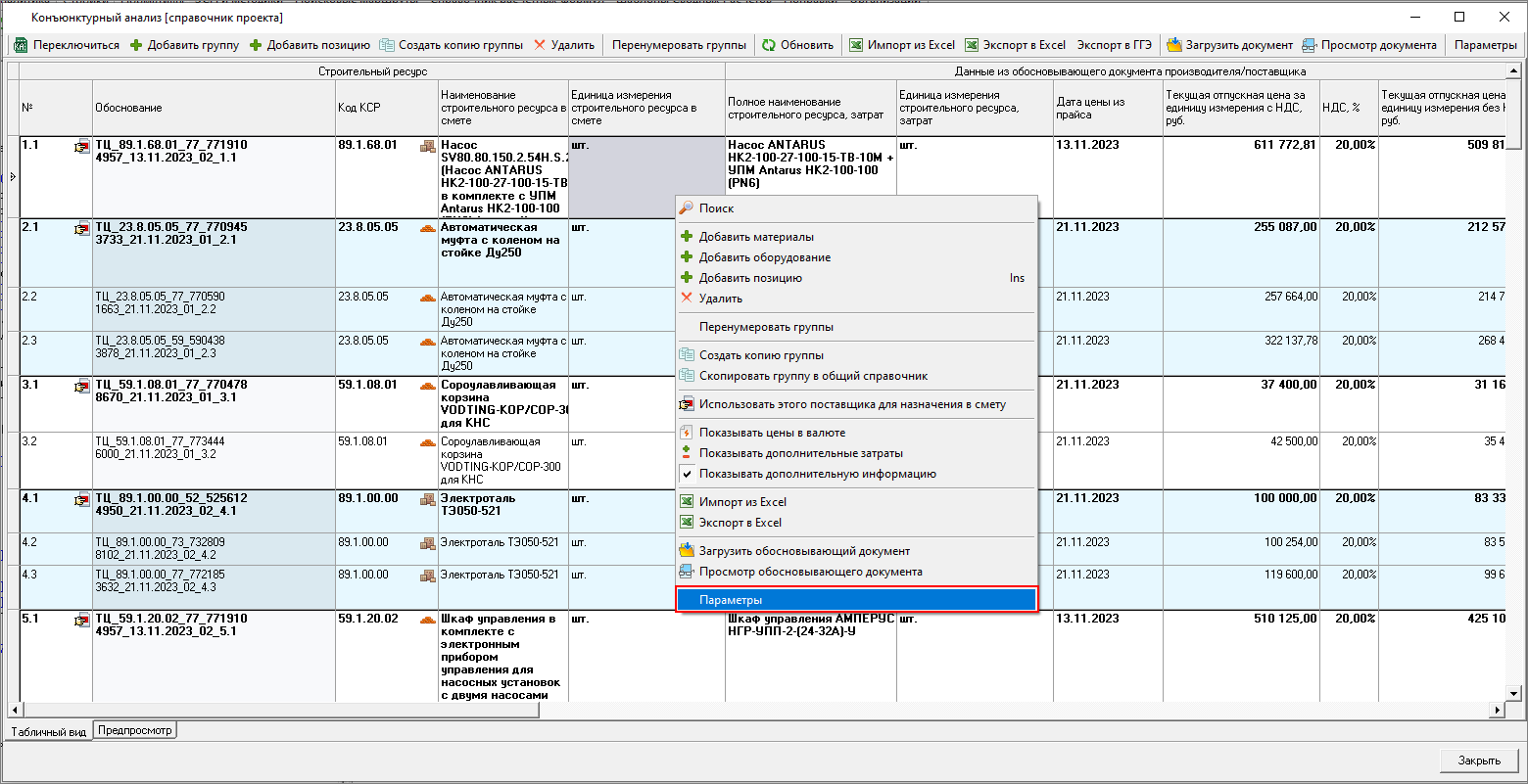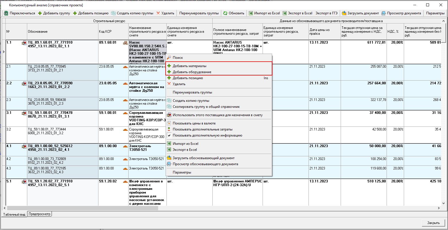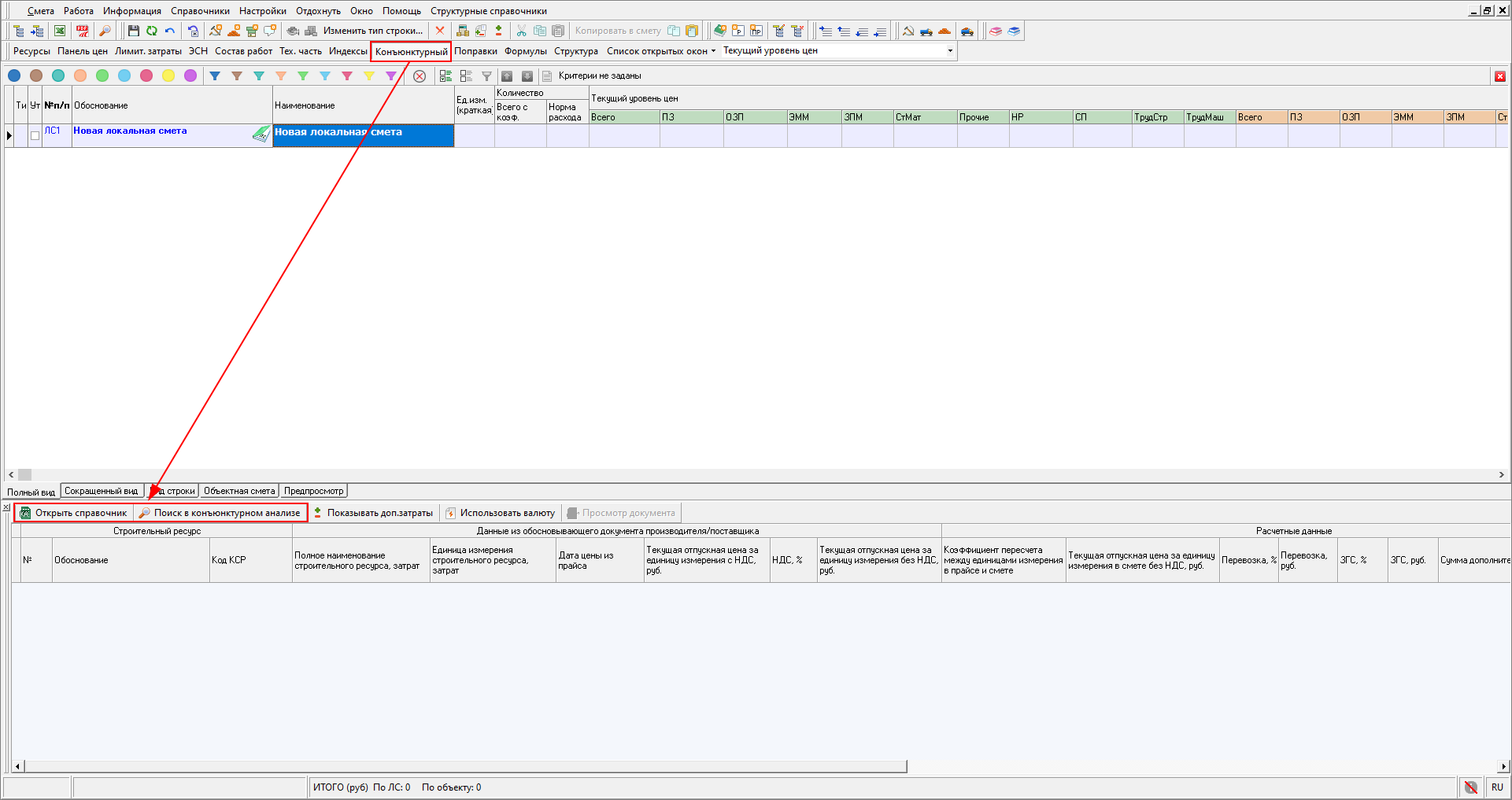 И из панели Конъюнктурный анализ в открытой смете