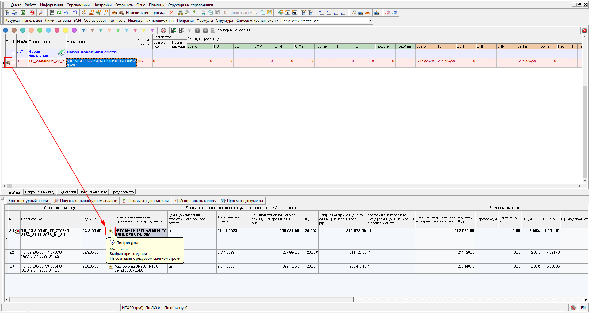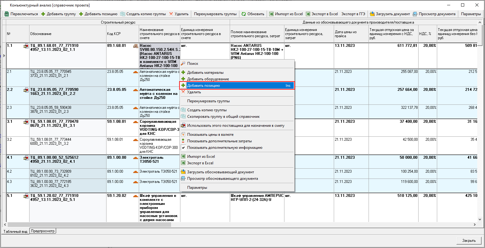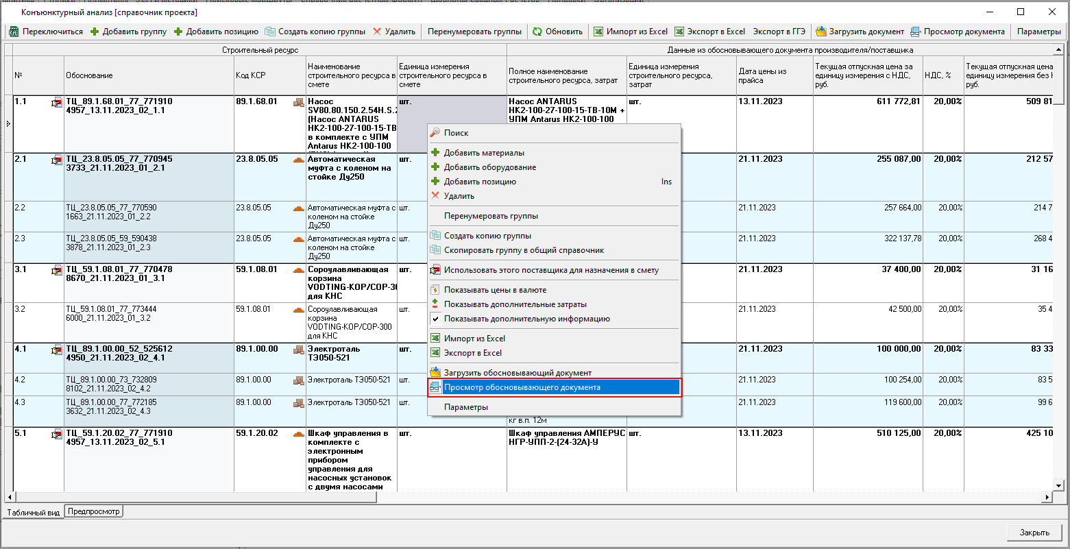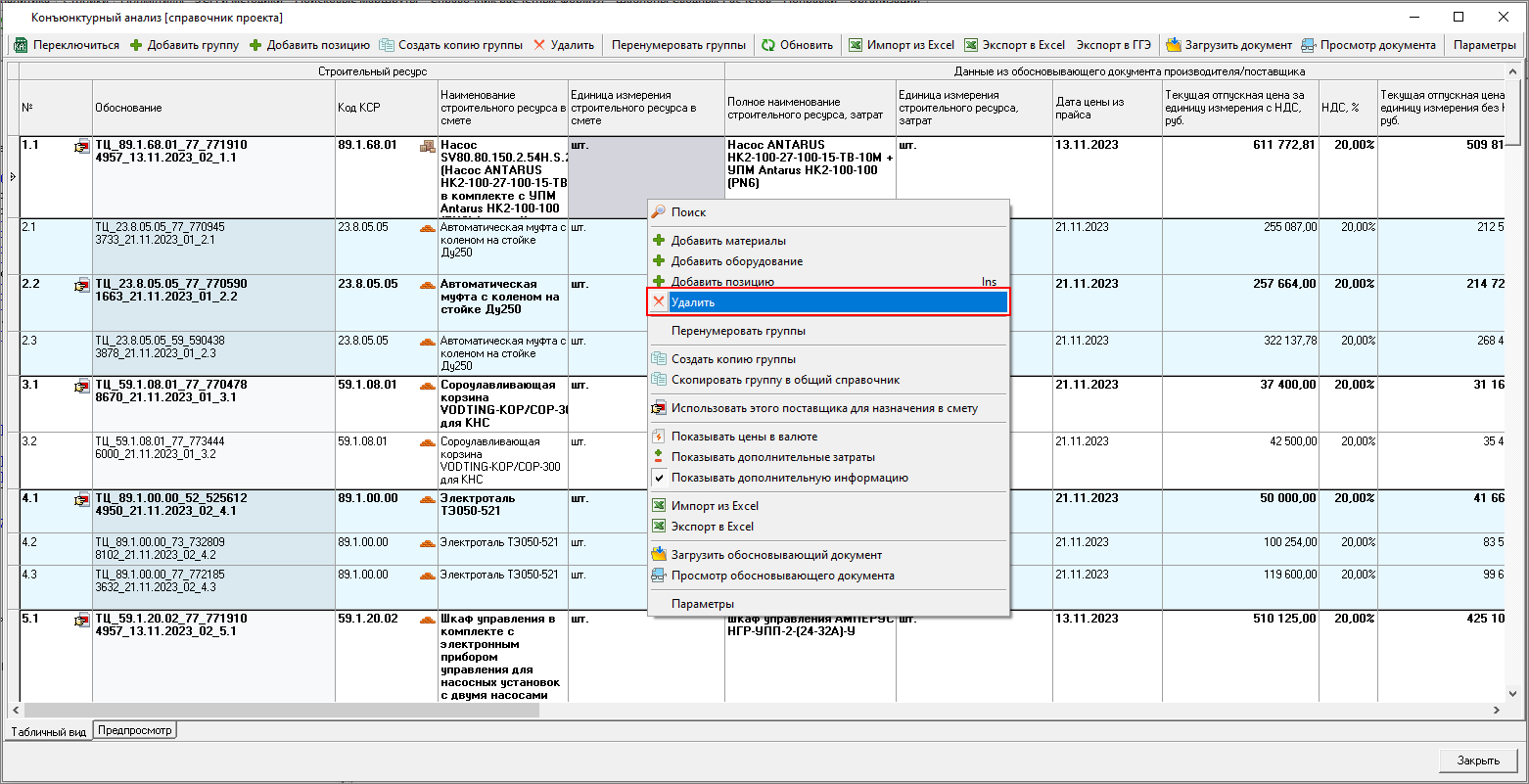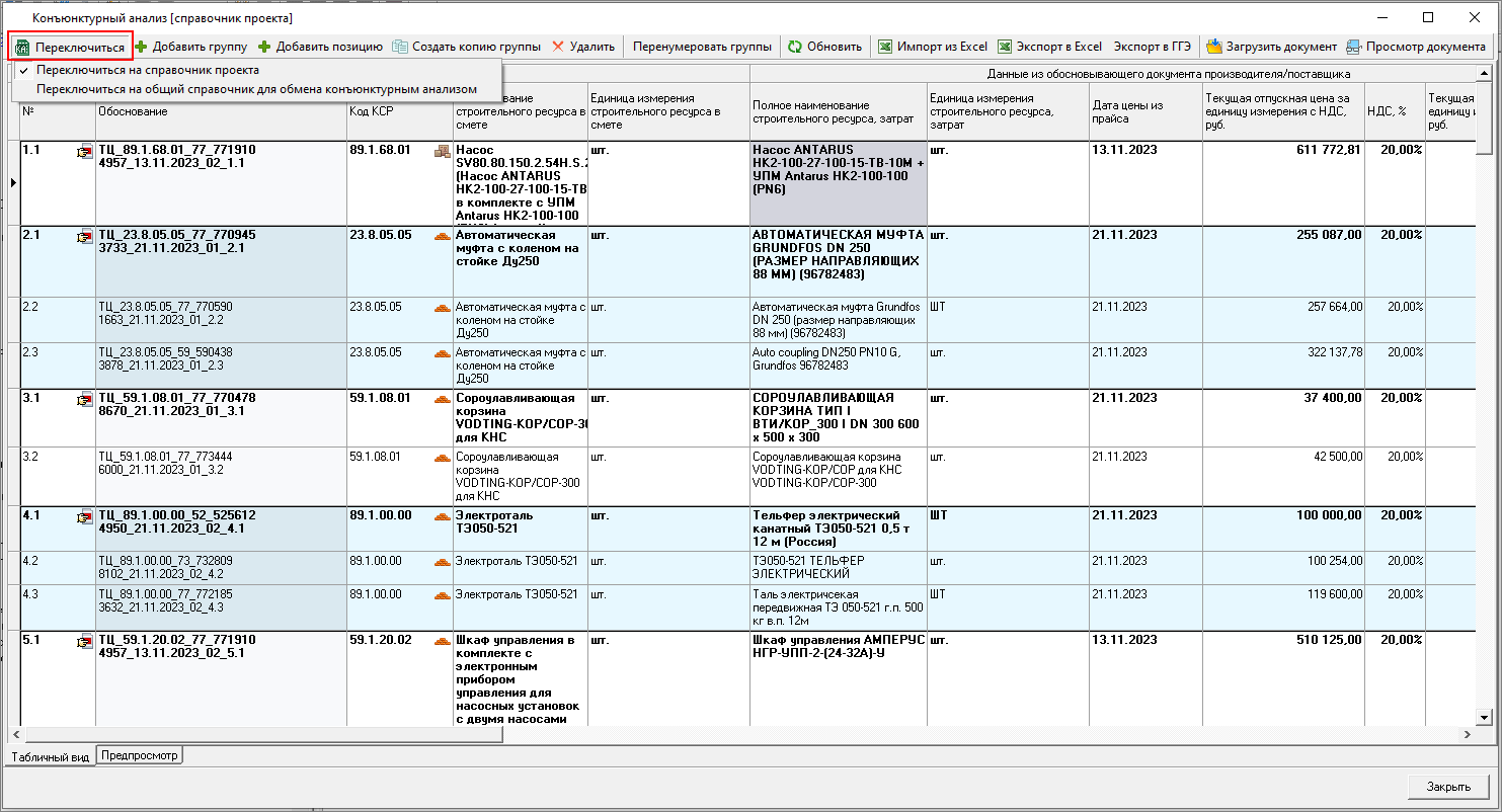 И из панели Конъюнктурный анализ в открытой смете
