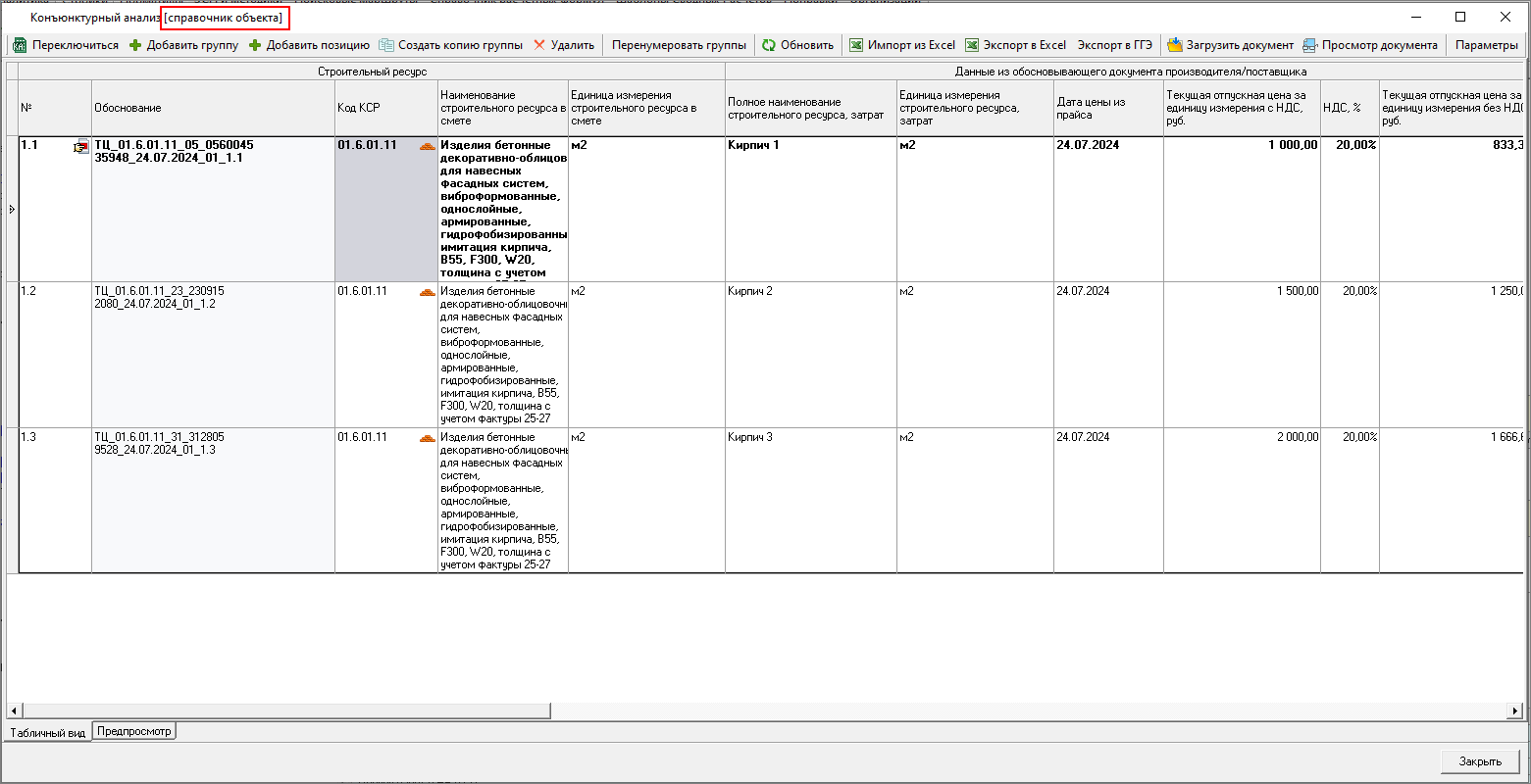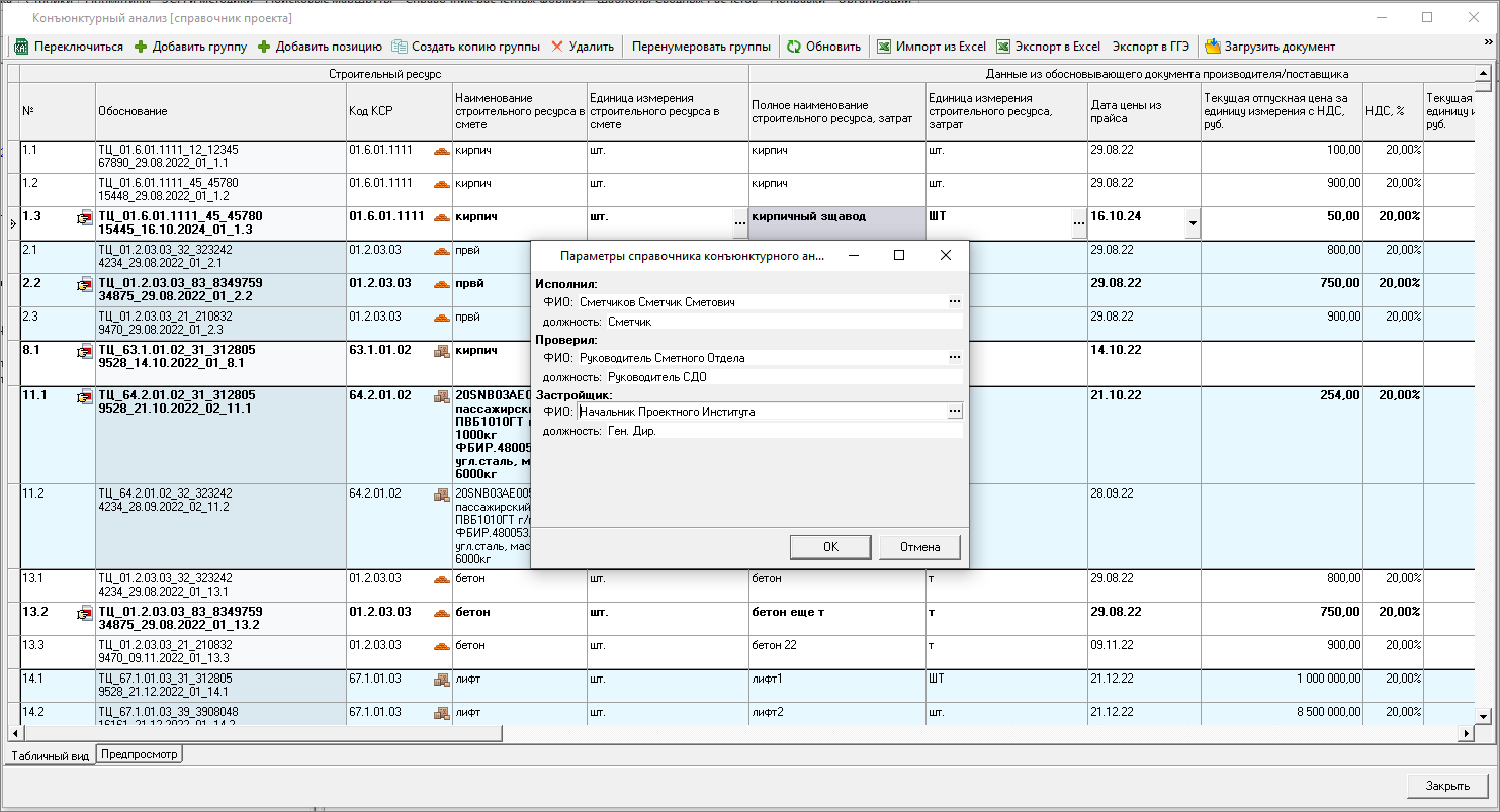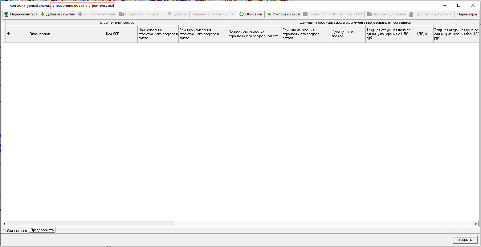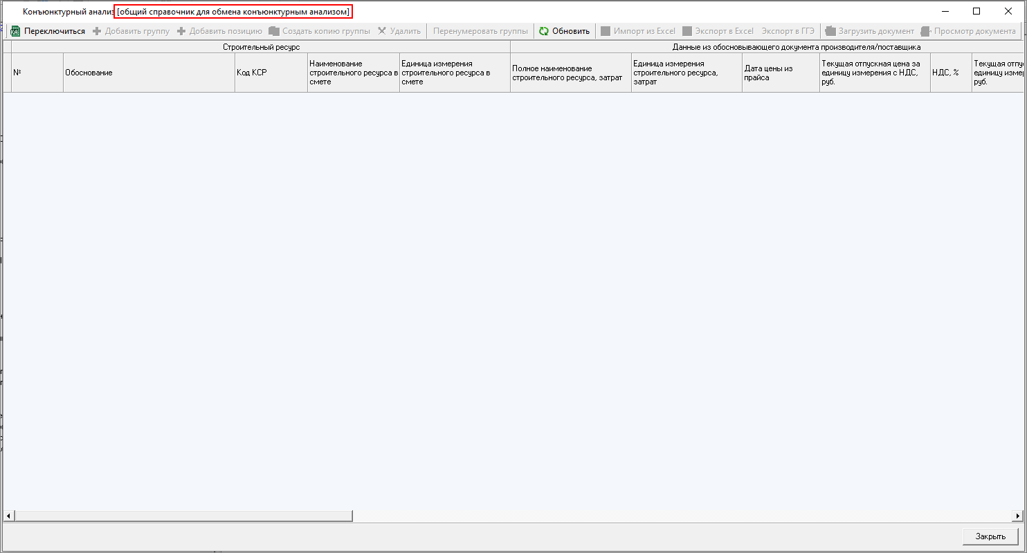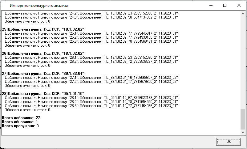 Изменена работа с результатами конъюнктурного анализа: теперь в смету можно только вставить уже подготовленные данные результата конъюнктурного анализа. Формирование данных производится в справочнике.