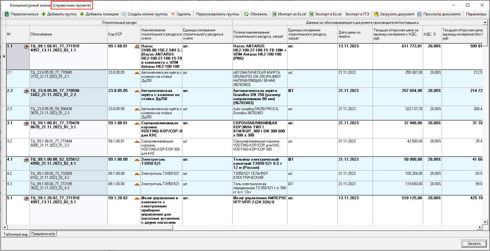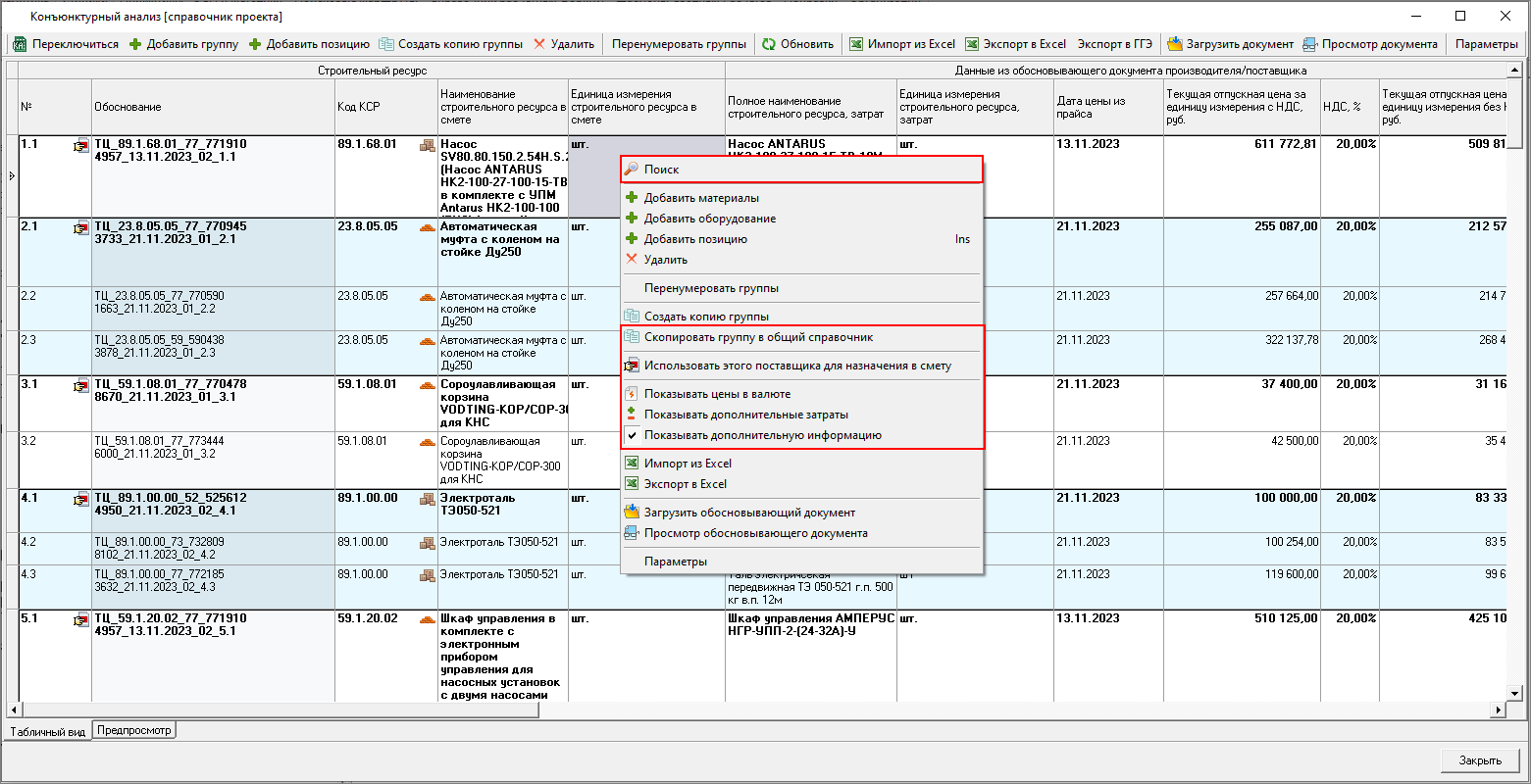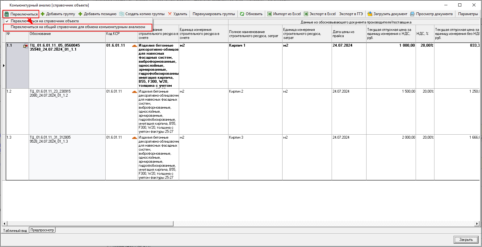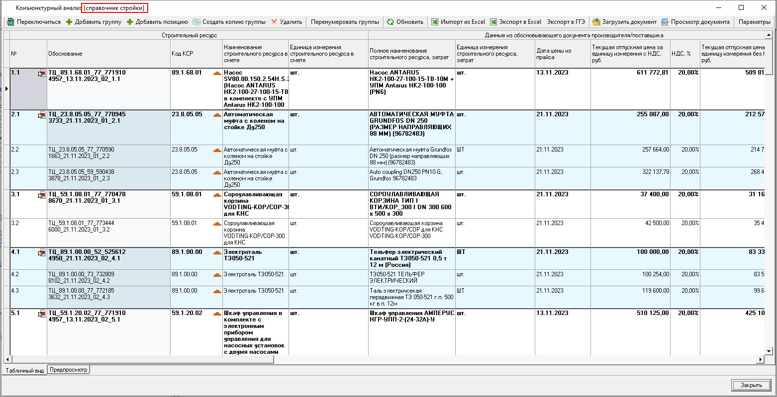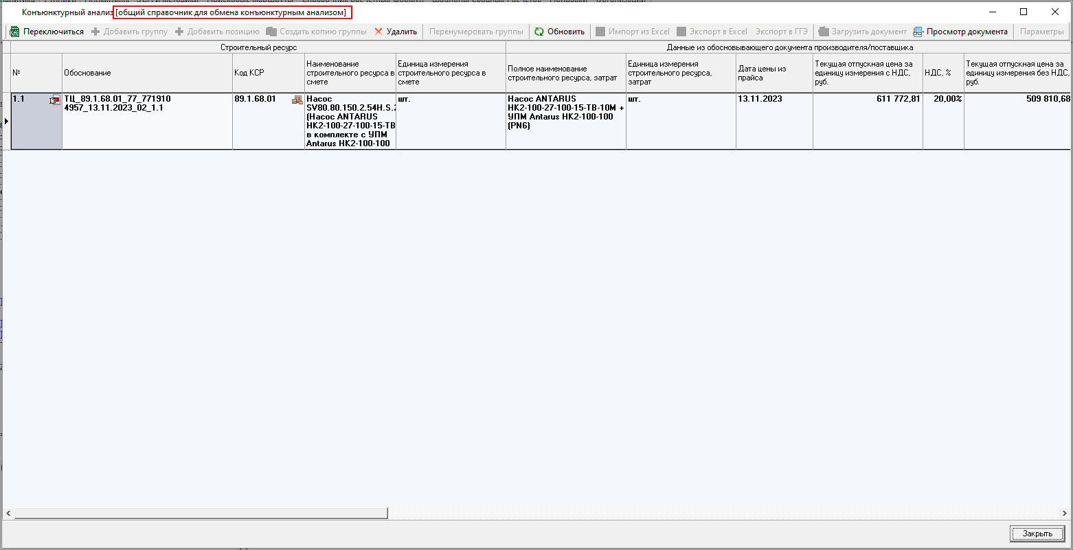 Изменена работа с результатами конъюнктурного анализа: теперь в смету можно только вставить уже подготовленные данные результата конъюнктурного анализа. Формирование данных производится в справочнике.
