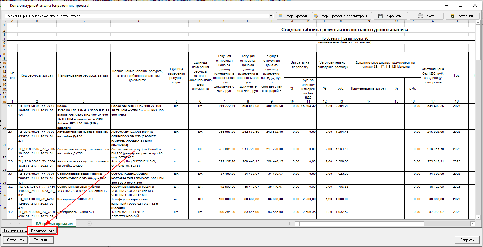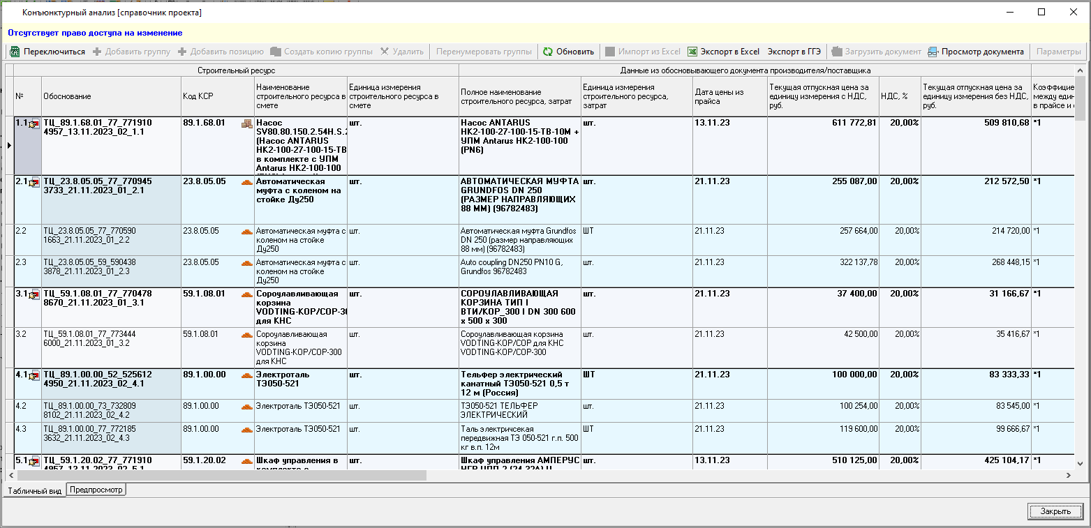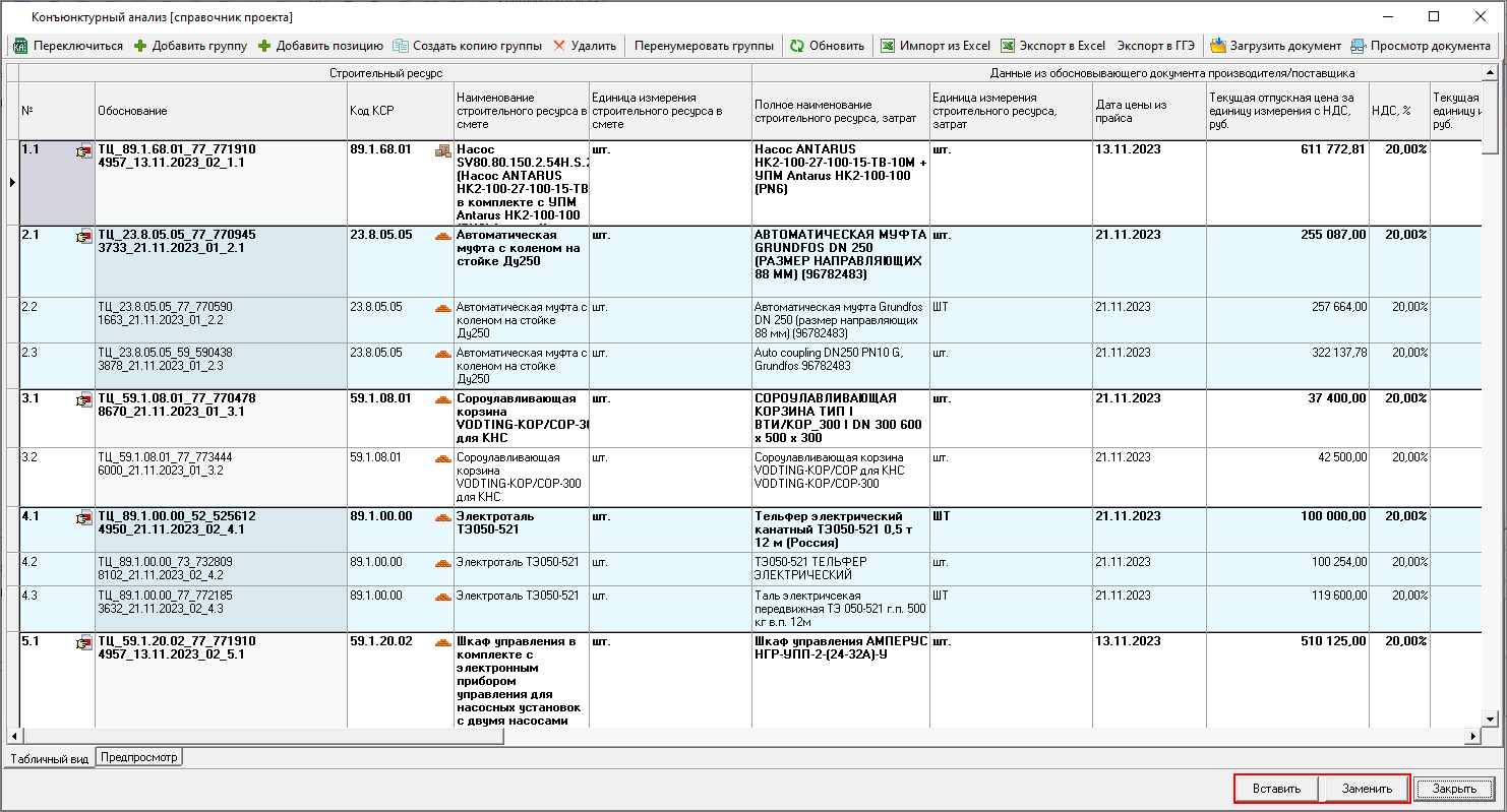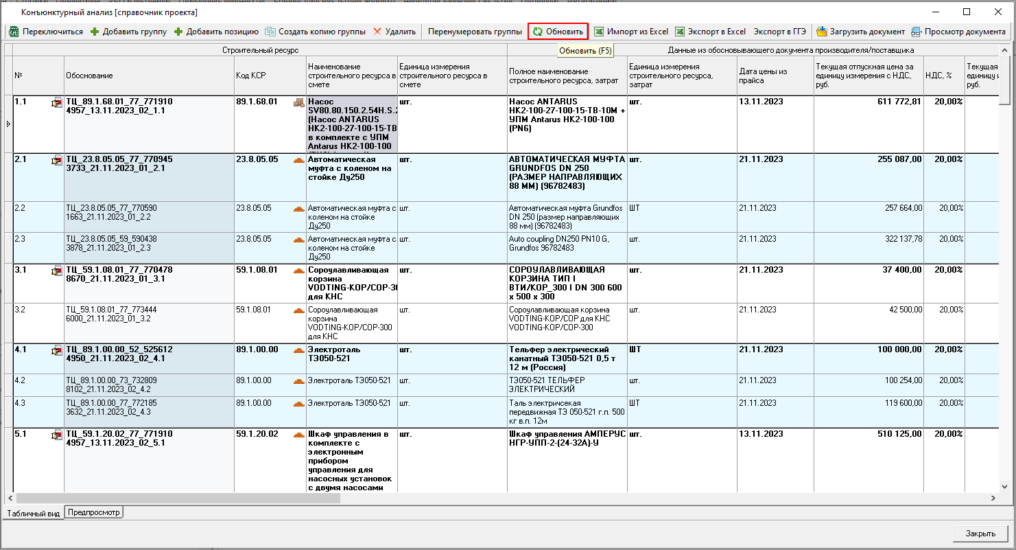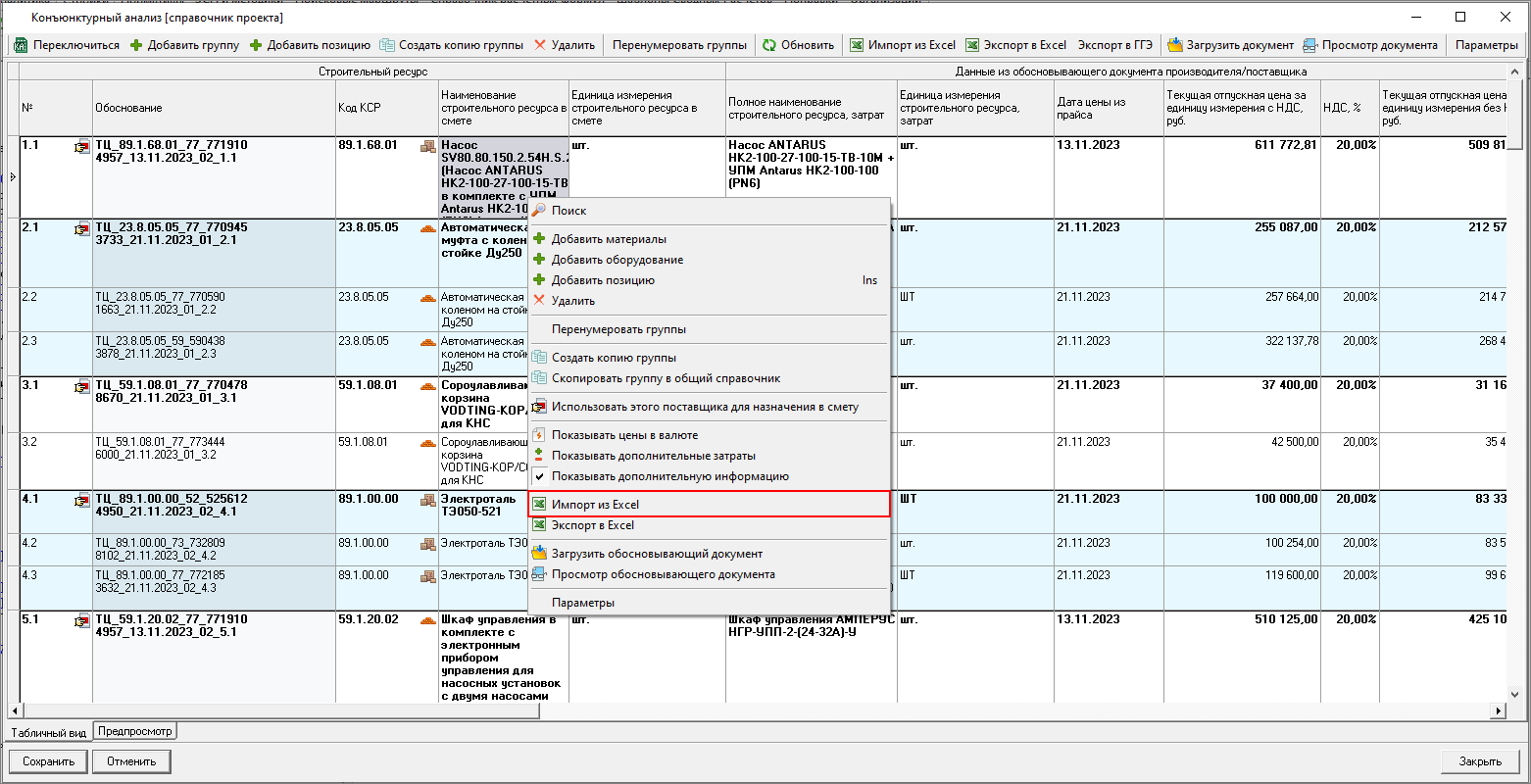 Изменена работа с результатами конъюнктурного анализа: теперь в смету можно только вставить уже подготовленные данные результата конъюнктурного анализа. Формирование данных производится в справочнике.