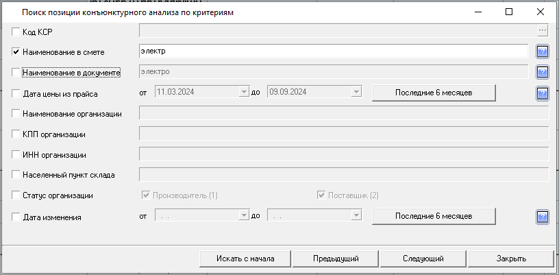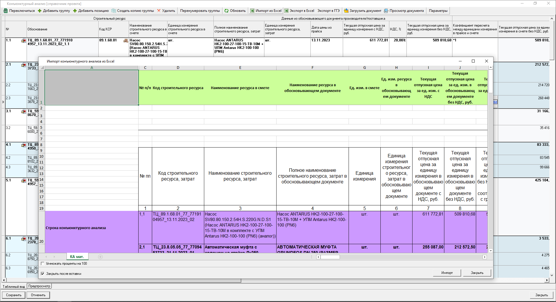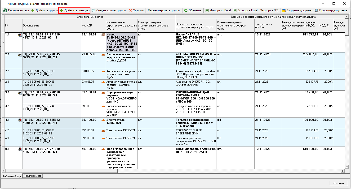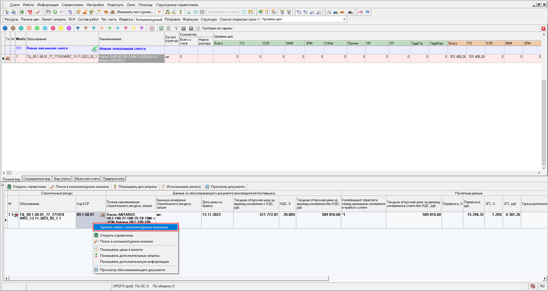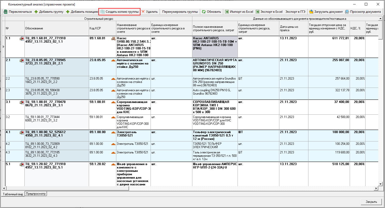 Изменена работа с результатами конъюнктурного анализа: теперь в смету можно только вставить уже подготовленные данные результата конъюнктурного анализа. Формирование данных производится в справочнике.