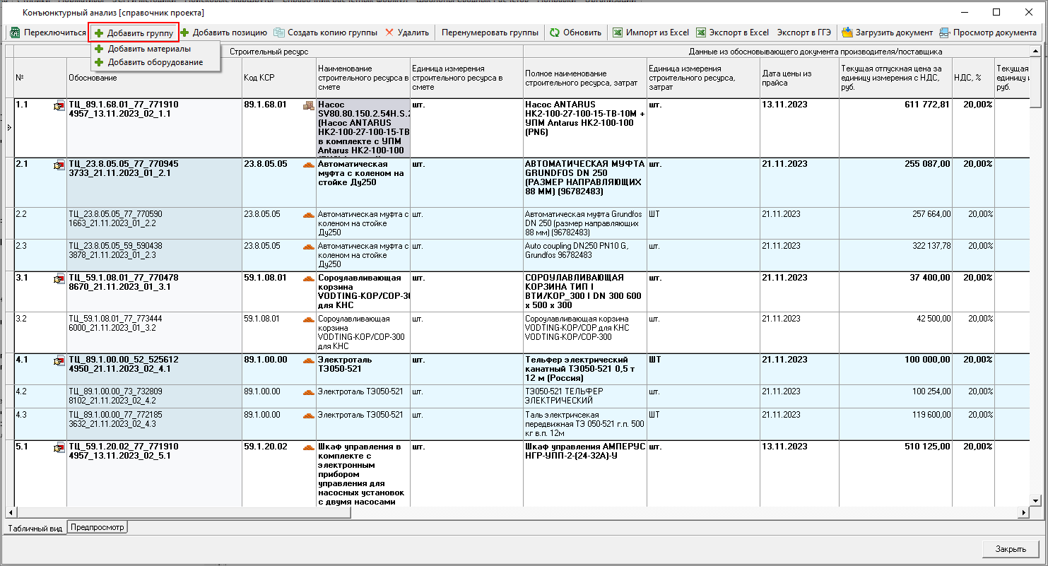 Добавить группу - позволяет вручную добавить группу из 3 позиций (материалы или оборудование) в конец справочника