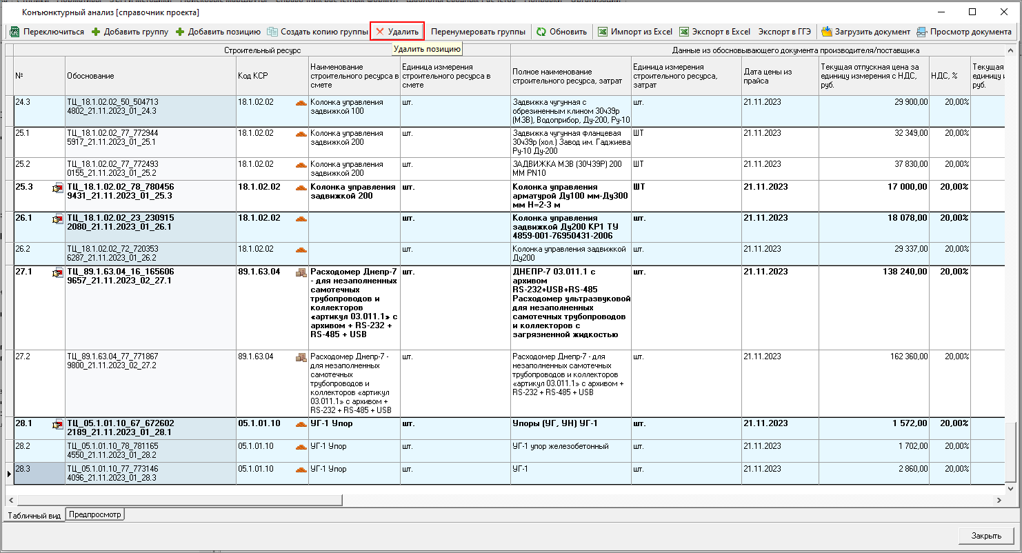 В случае, если позиция используется в смете, ее удаление невозможно