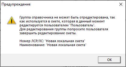 В случае одновременного изменения одних данных разными пользователями, в том числе, добавленных в смету, пользователю показывается предупреждение