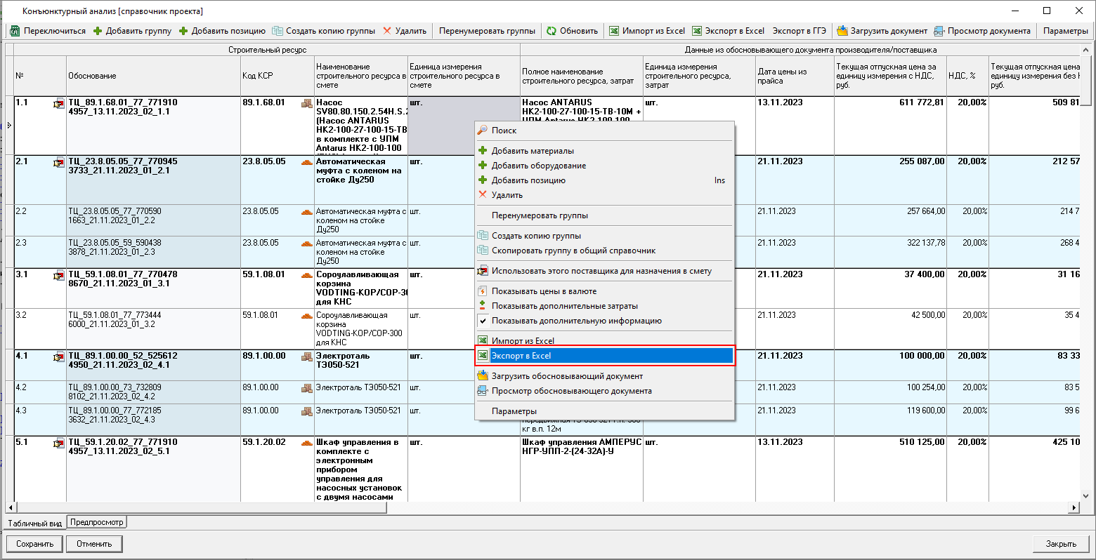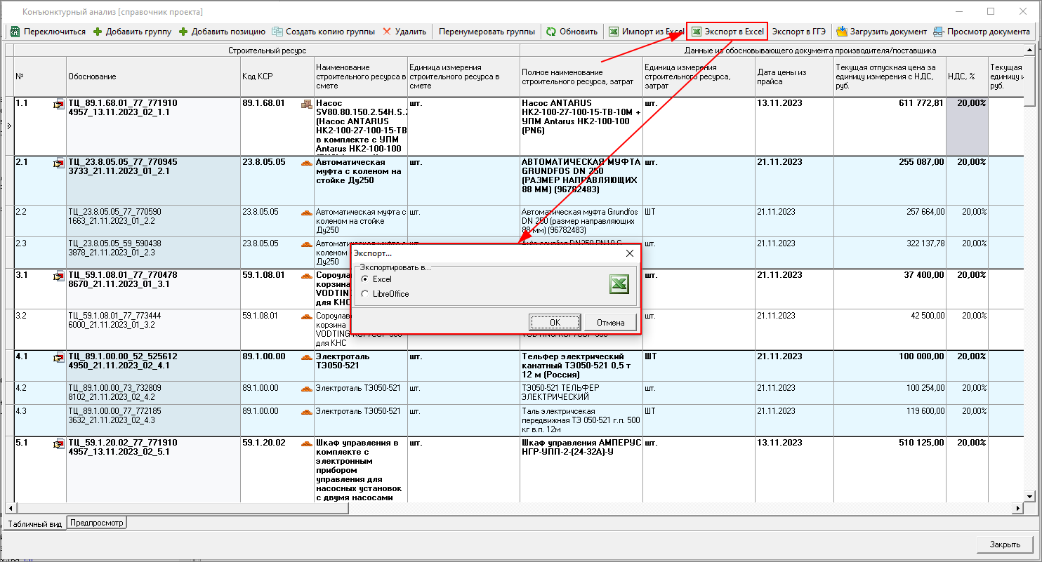 Экспорт в Excel - позволяет выгружать данные справочника результатов конъюнктурного анализа, которые используются в сметах, по выбранной форме в Excel/LibreOffice