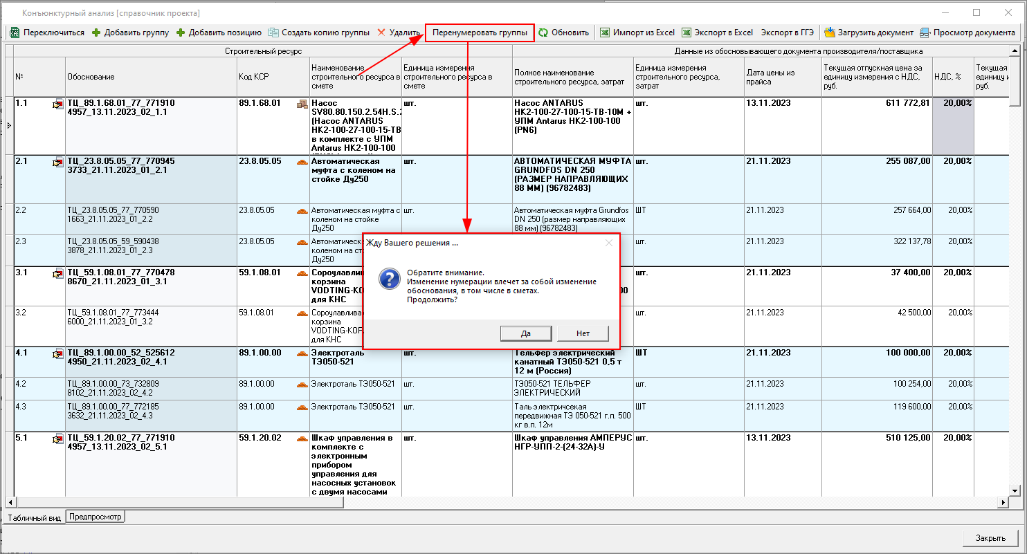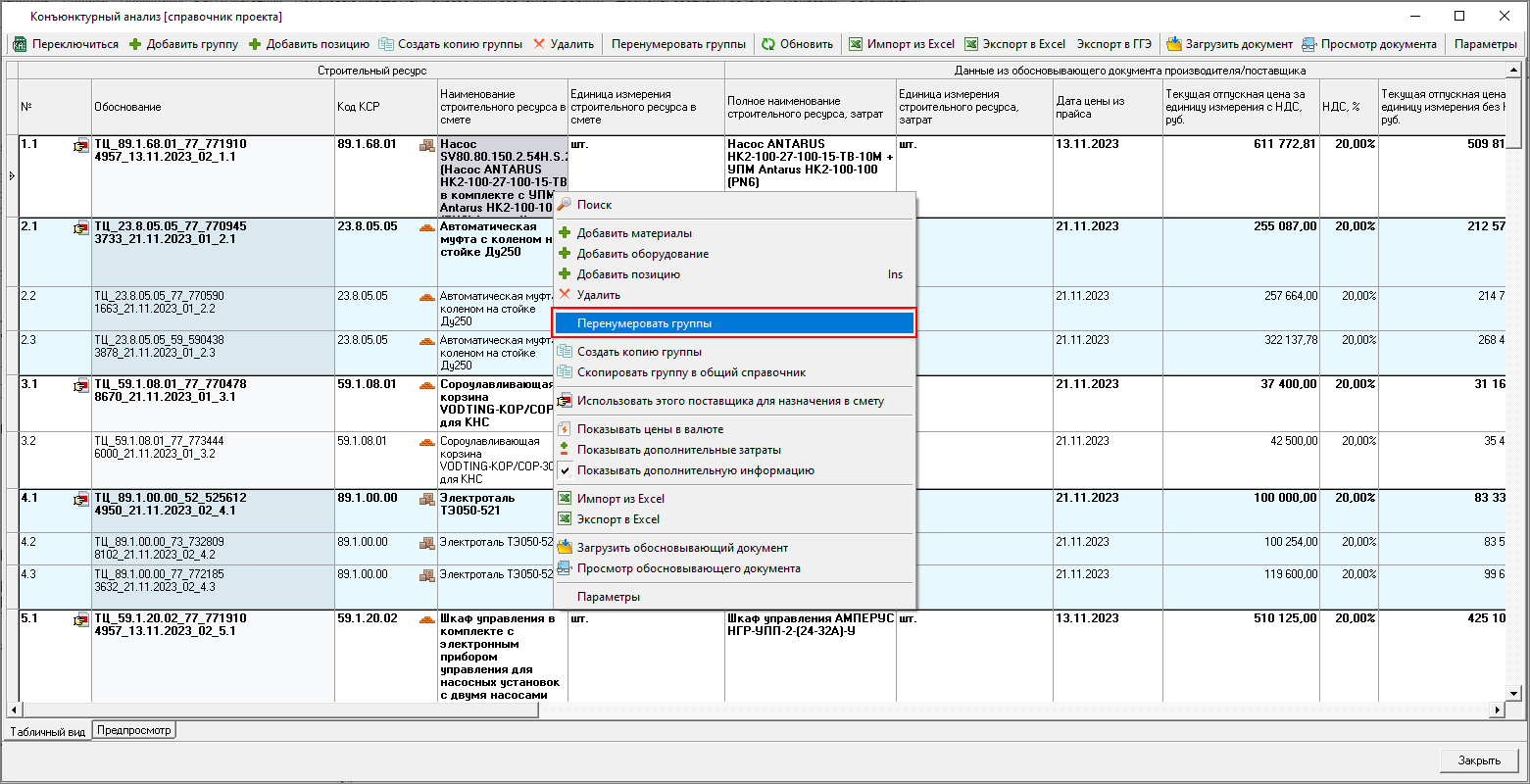 Перенумеровать группы - перенумеровывает все группы справочника с изменением обоснования позиции, в том числе в сметах