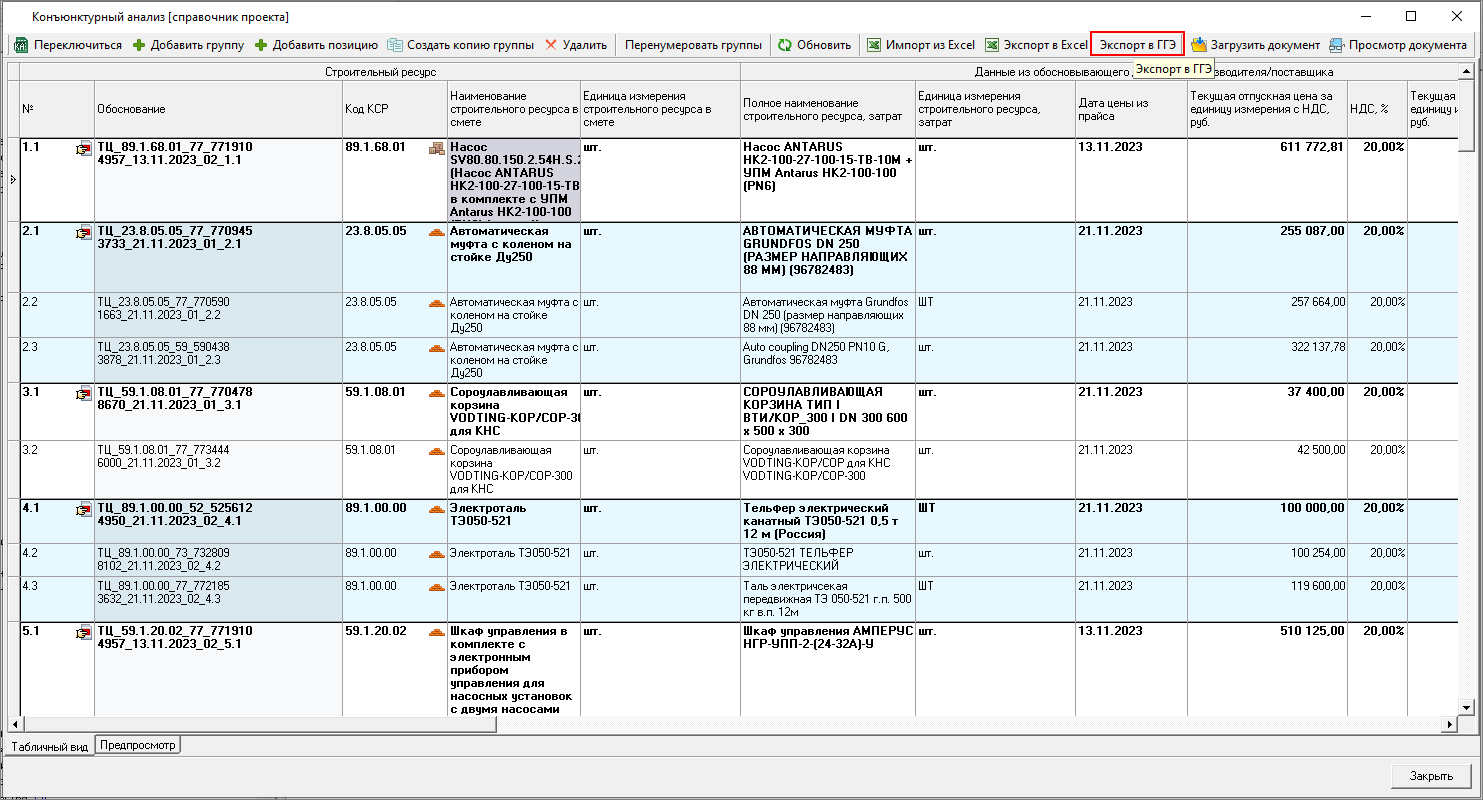 Экспорт в ГГЭ - позволяет выгружать данные справочника результатов конъюнктурного анализа, которые используются в сметах, в архив, необходимый для экспертизы