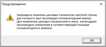 Изменение стоимостных данных строки, у которой есть связь с данными справочника конъюнктурного анализа, не предусмотрено
