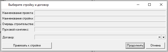 Для выбора стройки, нажмите кнопку "Привязать к строке", для продолжения без привязки - "Продолжить". Для отмены операции - "Отмена"