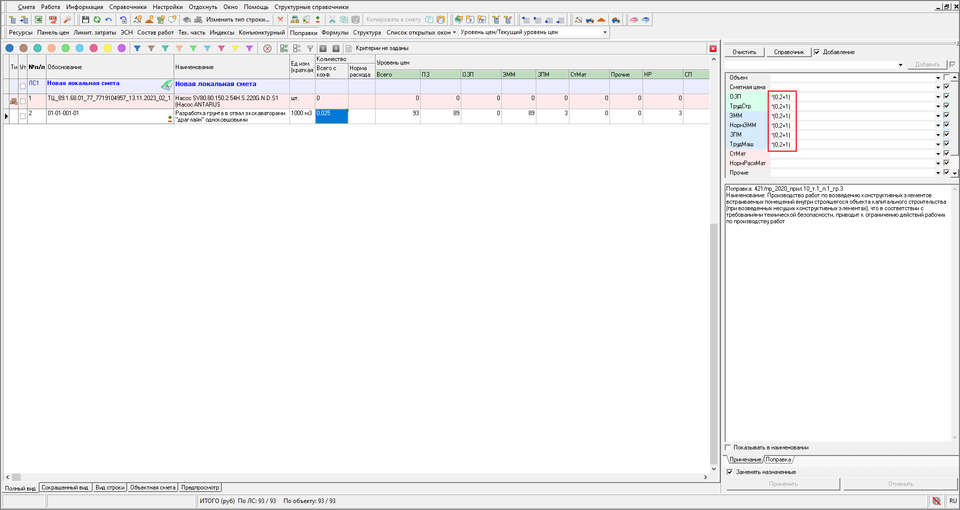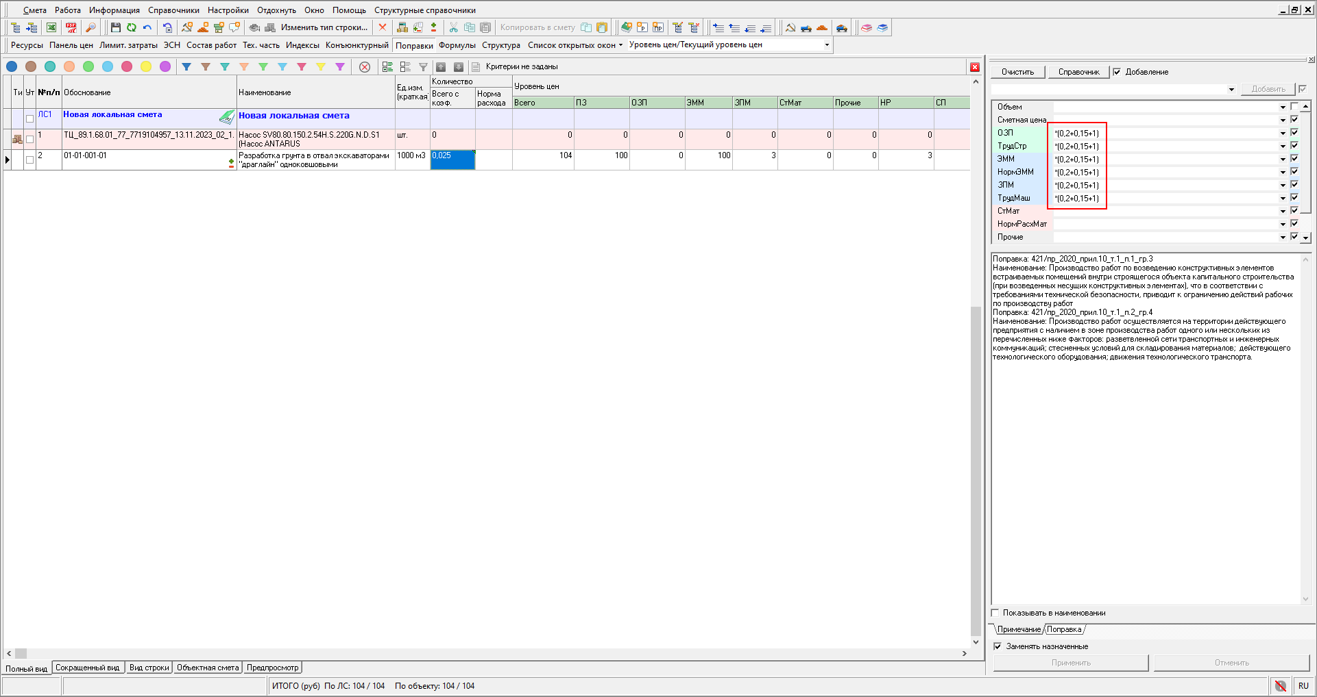 После выбора (добавления к расценке) суммирующей поправки из справочника, она автоматически будет представлена в виде формулы К = (Дробная часть коэффициента + 1)