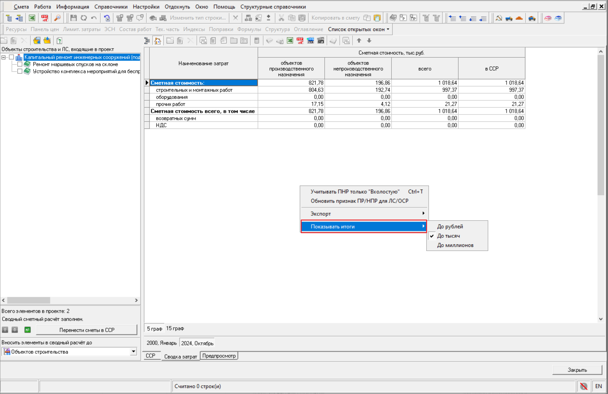 Выбрать разрядность отображения стоимостей можно в контекстном меню, выбрав пункт "Показывать итоги" (режим синхронизирован с ССР)